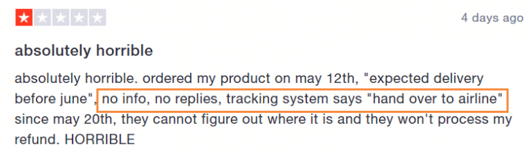 By analyzing Trustpilot’s negative reviews about AliExpress, I found that 80% of the complaints most frequently mentioned delivery delays, lack of tracking, products not meeting expectations, and unpleasant dispute processes. These are 4 main reasons why customers feel insecure.
